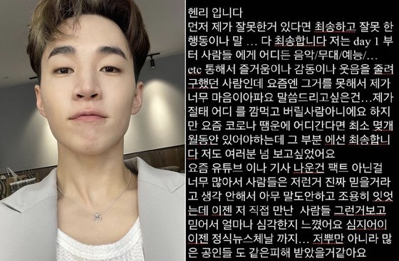 헨리는 19일 인스타그램에 "먼저 제가 잘못한 게 있다면 최송하고 잘못한 행동이나 다 최송하다"며 "진짜 마음이 아픈 건 대부분 저의 행동이나 말 때문에 불편한 게 아니라 '저의 피 때문'이라는 것"이라고 말했다. 헨리는 캐나다 출신인 헨리는 중국계 홍콩인 아버지와 대만인 어머니를 두고 있다. 자신을 둘러싼 논란에 해명은 하지 않고 모든 논란이 자신의 혈통 때문이라며 비판을 하는 사람들을 인종 차별주의자로 매도한 것이다.